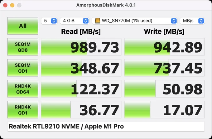 Macbook Proで速度チェックした所、シーケンシャルでリードライトともに約950MB/sとなりました。